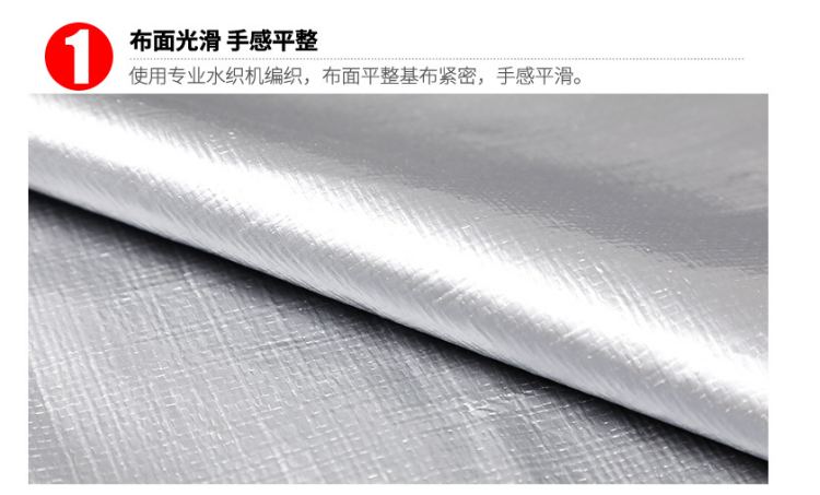 雙銀色PE防水篷布反光設計,有效阻擋紫外線,防止光老化。防曬:陰面朝上,反射太陽